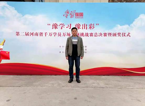 11月13日,“豫学习豫出彩”——第二届“学习强国”河南省千万学员万场答题挑战赛总决赛在郑州举行,来自全省各辖市及省委省直工委、省委高校工委、省政府国资委等组成的21支代表队105名“学习达人”同场PK,经过激烈的“知识对决”,我处教师、代表河南省高校工委参赛的杨枝茂在75分钟内连续答对1665题通关,获得优秀奖。