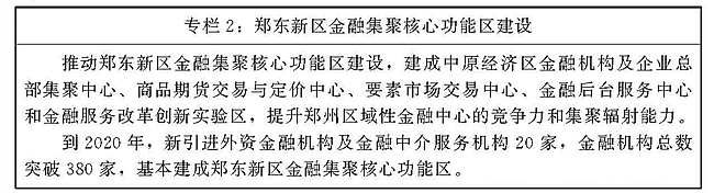 现代金融。壮大金融市场主体,发展多层次资本市场,增强金融创新和服务能力,构建具有较强融资和国际结算能力的区域金融体系,打造郑州区域性金融中心。力争到2020年,金融业增加值突破3000亿元。