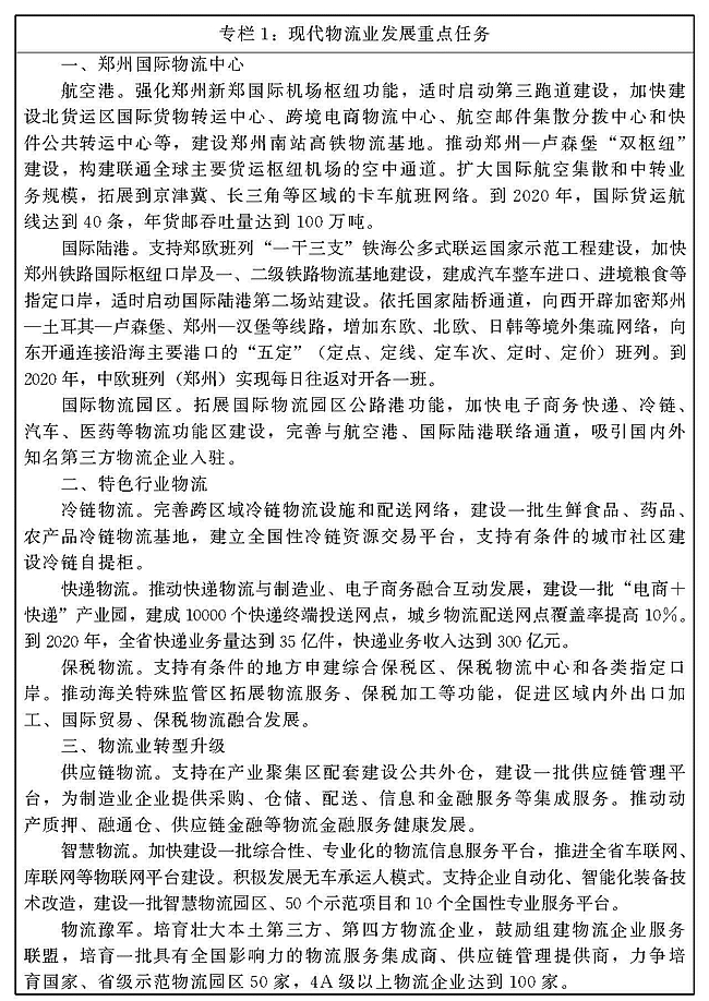 强化郑州国际物流中心功能,大力发展空、铁、公、海多式联运,加快郑州航空港、国际陆港物流枢纽建设,构建贯通全球的航空物流网络和东联西进的铁路物流网络,扩大国内集疏范围,打造国际航空物流中心和亚欧大宗商品商贸物流中心。完善物流节点网络,加强物流节点城市区域分拨和城市配送网络建设,改善农村物流基础设施,完善快递物流二级节点,推动与国内主要经济区物流通道和物流基础设施互联互通,形成内捷外畅的物流快速集散体系。大力发展特色物流,重点发展冷链、快递、保税等特色物流,建设一批与生产制造和商贸流通相配套的物流园区,积极发展供应链物流,支持物流企业向多式联运经营人、物流集成服务商转变,鼓励建立供应链管理信息化平台和供应链配送中心,开展一体化供应链服务。推动物流企业提供第三方、第四方物流解决方案及物流金融等供应链管理服务。推动智慧物流发展,加快互联网、大数据、云计算等信息技术与物流深度融合,搭建物流资源交易平台,鼓励企业发展云仓、智能分拣和智慧物流配送,推动物流园区智能化改造提升。加强物流标准化和信用体系建设,降低社会物流成本。
