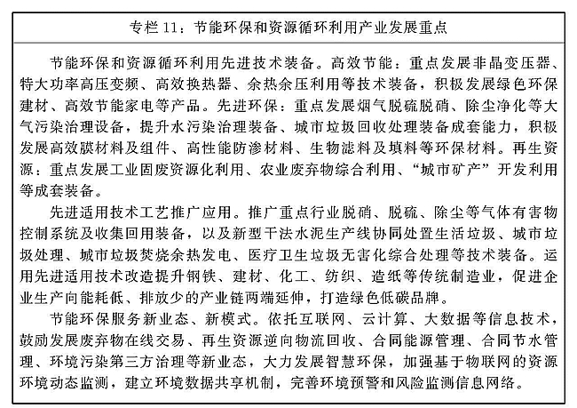 3.节能环保和资源循环利用产业。大力发展节能环保和资源循环利用先进技术装备。重点研发高效节能装备、产品及关键零部件,推进节能技术系统集成,加快节能技术装备升级换代。鼓励和支持产学研合作,组建产业技术创新战略联盟,加快技术集成创新研究与应用,集中突破工业废水、废气、土壤农药残留、重金属污染等一批关键治理技术,加快形成成套装备、核心零部件及配套材料生产能力,推动污染防治技术装备水平迈上新台阶。推进尾矿深度加工和综合利用技术研发,提高废弃电子电器、报废汽车拆解利用的技术装备水平,支持二氧化碳捕集、利用、封存技术研发,提升资源循环利用技术装备水平。