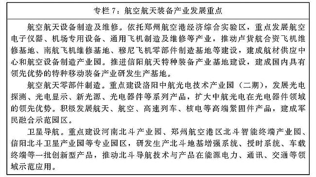 4.航空航天装备。加快推进军民融合,依托在豫军工院所和企业,突破航空航天装备产品关键技术,建设航空航天装备产品制造基地。重点依托郑州航空港经济综合实验区,加快发展航空航材制造及维修产业。依托安阳、上街通用航空试验区,加快发展通航飞机制造及维修产业。依托洛阳、信阳航空航天装备产业基础,加快推进洛阳航空光电产业基地、信阳航天航空紧固件和特种装备产业基地、河南航天液压气动元件技术研发中心及产业基地建设。大力发展卫星导航、卫星遥感产业,推动北斗导航和高分在重点领域部署,以应用促进北斗导航和高分产业发展,建成研发、生产、应用服务产业链条基本完善的产业集群。