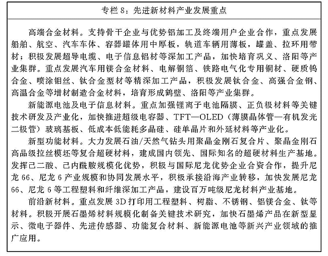 以超轻化、合金化、专用化、高性能、绿色化为主攻方向,重点发展高端合金材料、新能源电池及电子信息材料,提升超硬材料、尼龙材料发展优势,积极发展新型功能材料,研发石墨烯、3D打印材料、纳米材料等前沿新材料,提高先进材料供给能力。力争先进材料产业规模达到4000亿元,成为国内重要的高端合金材料产业基地。