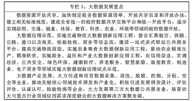 推进大数据产业集聚发展。规划建设大数据特色产业园区,建立大数据产业公共服务体系,加快大数据创新支撑体系建设,积极引进和培育一批大数据骨干企业,加快发展大数据核心产业和关联产业,完善大数据产业链。打造全国一流的大数据产业中心。