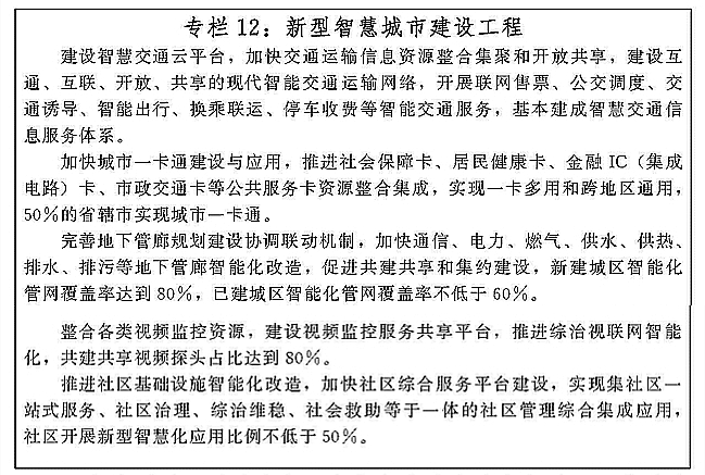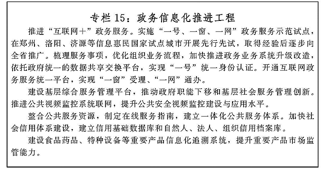 统筹建设新型智慧城市。以建设国家级和省级新型智慧城市试点为引导,加强顶层设计,完善智慧城市时空信息云平台,加快智能感知基础设施建设,深化城市智慧化服务应用,建设中原新型智慧城市群。推动公用基础设施智能化改造,优先推进通信、电力、供水、供热等管网综合智能管廊建设,实现集约建设、精准管理。加快智慧城管建设,完善网格化管理服务平台,加强对市政市容、交通路网、社会治安等的智慧管控,构建多部门联动的管理服务机制,促进管控信息跨部门、跨区域共享。建设涵盖社区治理、公共服务、便民利民服务、志愿互助服务、居家养老、物业管理等功能的新型智慧社区,促进城市管理智慧化和社区服务便民化。加快建设城市应急联动系统,推进自然灾害、事故灾难、公共卫生、社会综治等方面应急资源整合与共享。加快推进智慧交通建设,构建交通行业运营智能化综合平台,完善公路水路基础路网监测设施,提高道路运输综合管理水平。加强公众出行服务系统建设,保障公众安全便捷出行。