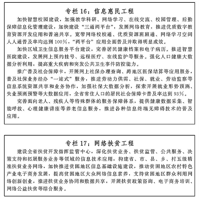 社会领域信息化水平大幅提升。全省统一的电子政务网络逐步完善,承载各类纵向政务系统68个。电子政务应用深入普及,有效提升了各级政务部门的社会管理和公共服务能力。以各级政府综合门户网站为核心的政务门户网站群成为信息公开的重要窗口。省级政务云平台和数据中心建设初具规模并投入使用。社会保障、医疗卫生等民生领域信息化应用逐步深化,社会保障卡、居民健康卡发卡量分别超过6000万张和600万张,均位居全国第一,在全国率先实现新农合全省跨区即时结报;开展了数字化医院评建工作,医院精细化管理水平、医疗服务效率和质量显著提高。教育系统“三通两平台”(宽带网络校校通、教学资源班班通、网络学习空间人人通,教育资源公共服务平台、教育管理公共服务平台)建设取得阶段性成效,全省78%的中小学校接入了宽带网络,43%的中小学校构建了校园网络环境,72%的学校建设有多媒体教室,使用网络学习空间的师生人数达到300万人。农业数据中心、“三农”信息服务平台以及12316“三农”热线省级综合服务平台初步建成,涉农综合信息服务能力明显增强。国家和省级智慧城市试点建设稳步推进,城市管理和服务智慧化应用逐步普及。“十二五”期间,我省信息化建设取得了巨大成就,但还存在一些突出问题,主要表现在:信息化发展水平与经济社会发展需求差距较大,区域和行业信息化发展水平不平衡,融合创新能力较低。产业支撑能力不足,电子信息产业基础相对薄弱,软件和信息服务业不发达,龙头企业偏少,自主创新能力弱,产业链协同配套不完善。信息化建设推进滞后,电子政务共建共享水平较差,信息资源集聚和共享程度较低。信息化统筹推进力度不够、职能分散,统筹规划和顶层设计难以落地。信息化人才资源结构性矛盾突出,高端人才、复合型人才引进、培养和激励机制尚不完善。网络安全保障体系不健全,网络安全防御能力偏弱,难以满足网络经济强省建设需求。