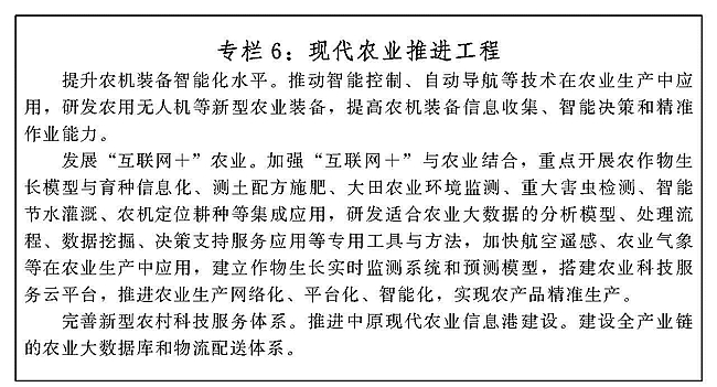 全面推进现代农业建设。推进物联网等信息技术在农业生产经营领域应用,建设农业信息综合数据库和信息服务支持系统,发展感知农业、精准农业和订单农业,构建智慧型现代农业生产经营体系。加强农业生产环境、自然灾害、生产设施等感知数据采集、汇聚和关联分析,实现农业资源环境精准监测,提高农业生产管理、指挥调度等数据支撑能力,推动涉农信息资源共建共享,推进全省农业大数据集聚。支持电商企业和农业产业化龙头企业、农村专业合作社、种养大户等深度合作,发展订单农业。培育农业信息服务企业,发展专业化的“三农”信息服务,提升“三农”信息化支撑能力。
