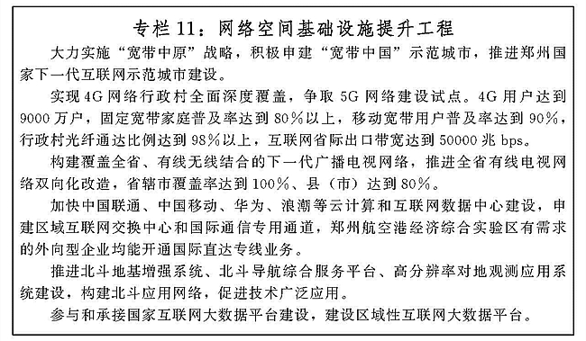——信息基础设施进一步完善。建成高速、移动、安全、泛在的新一代信息基础设施,实现宽带网络城乡全覆盖,郑州互联网骨干直联点直联带宽达到2000吉bps(比特/秒)。建成3—5个全国大型云计算中心,机架总规模达到7万架,达到140万台服务器的装机能力,全面形成支撑全省网络经济发展的云服务基础设施。