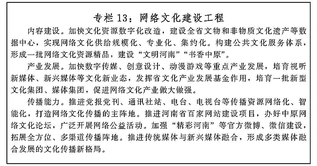 推动中原文化网上交流合作。充分发挥“一带一路”郑州内陆开放型经济高地的核心带动作用,打造网上“丝绸之路”文化交流中心,推动与沿线城市和国家在教育、科技、文化、旅游等领域的网上合作与互动。搭建线上线下相结合的文化产业交易平台,吸引有影响力的文化企业来豫投资发展,加强与沿线城市和国家互办线上文化年、艺术节、电影节等活动,推动豫剧、少林功夫、太极、杂技等河南本地特色文化产品从网上率先“走出去”。鼓励借助新媒体实现中原文化传承和创新,打造一批数字文化创意产业在线众创空间,鼓励河南特色原创内容产品生产,充分挖掘中华老字号等河南民间特色传统技艺。发展文化数字内容产业,推动传统文化企业数字化、网络化转型,鼓励文化创意企业对接国内外市场,促进文化创意企业开放合作。