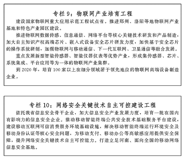 ——电子信息产业竞争力大幅提升。建设全球重要的智能终端研发制造基地,形成较为完善的智能终端全产业链集群。打造以郑州市为核心的国家级信息安全产品研发生产基地。电子信息产业规模达到万亿级,软件和信息服务业、电信业主营业务收入分别达到800亿元和700亿元。核心关键技术和相关优势产业实现新突破。
