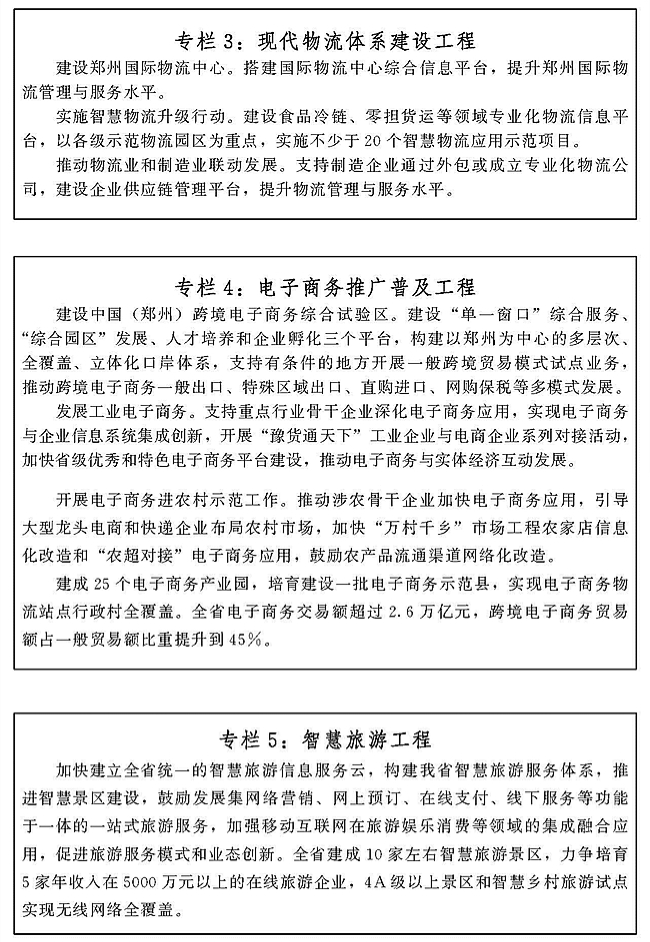推进互联网和服务业融合创新。围绕现代服务业强省建设,加强新业态开发,推动产业跨界融合,扩大和提升现代服务业供给规模和质量效益。加快推进互联网技术与物流、电子商务、金融等生产性服务业深度融合,支持第三方物流企业与互联网企业合作,搭建社会化物流信息服务平台,推动深度感知智能仓储系统建设,构建现代物流服务体系。发展电子商务,加快中国(郑州)跨境电子商务综合试验区建设,推进郑州、洛阳国家电子商务示范城市建设,培育壮大一批特色电子商务平台,提高电子商务集聚发展水平。规范互联网金融发展。发展基于互联网的生活性服务业,建设一批智慧化的国家级旅游度假区、生态旅游示范区和5A级旅游景区,深化居民家庭、文化体育、健康养老、住宿餐饮等服务领域智能化应用。加快推进服务业向制造业渗透,构建“服务+制造”“平台+模块”的网络化协调生产服务体系。发展平台经济、众包经济、创新经济、跨界经济、分享经济等新兴服务业,培育服务新业态、新模式。