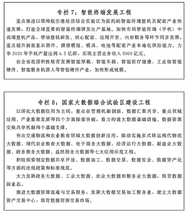 推动电子信息产业快速发展。大力发展智能终端产业,做大做强智能终端全产业链集群,建成全球重要的智能终端研发生产基地。聚焦光通信核心芯片及其延伸产业,重点发展超高速大容量智能光传输核心芯片及相关领域。推动新型锂离子电池、超级电容等储能电池研发生产。巩固提升轨道交通、医疗卫生、智能电网等领域行业应用软件的国内领先地位。大力发展在线监测、智能控制、信息安全、现代农业等领域的基础应用软件。围绕智能设备制造业研发嵌入式软件、工具软件、工业平台软件等。引导软件企业向提供综合解决方案和信息技术服务商转变,鼓励信息技术服务企业发展集高端咨询、软硬件解决方案、信息技术服务于一体的新型业务模式。积极参与信息技术服务标准体系建设和推广。实施大数据发展战略,建设国家大数据综合试验区。推动智能硬件、虚拟现实产业发展。加快北斗卫星导航技术产品研发和示范应用,形成集聚发展的北斗产业体系。加强网络与信息安全核心技术、产品研发和自主创新,发展移动网络信息安全产业,推进安全技术成果转化和产业化,打造以郑州市为核心的国家级信息安全产品研发生产基地。