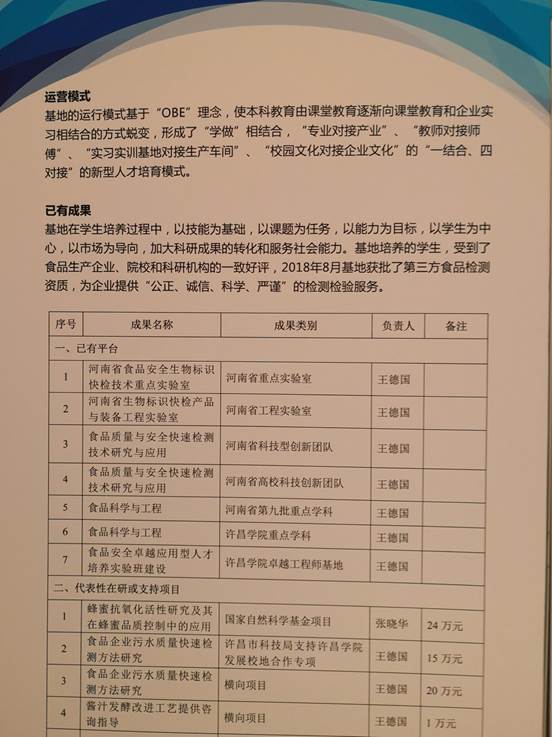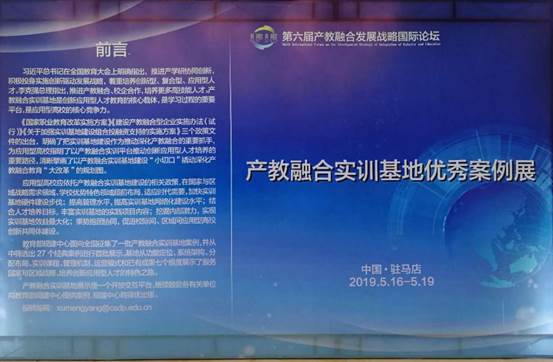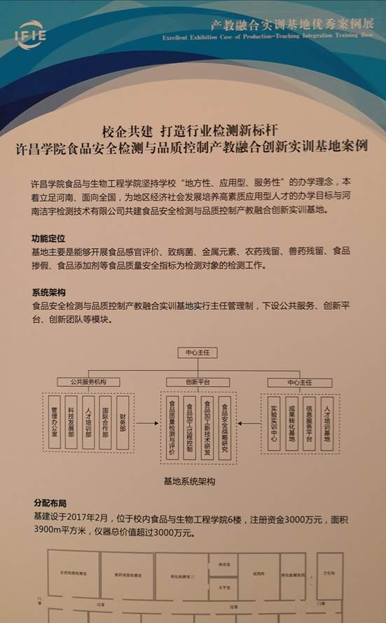 5月17日至18日,第六届产教融合发展战略国际论坛在驻马店盛大开幕,论坛由教育部学校规划建设发展中心联合中华职业教育社、中国职业技术教育学会、应用技术大学(学院)联盟举办,驻马店市人民政府、黄淮学院承办。论坛对产教融合实训基地优秀案例进行了展示。相关案例展现了地方高校在产教融合发展、企业与学校协同育人方面取得的成就,对高校转型,做好应用型人才的培养工作具有示范性的作用。我校食品与生物工程学院王德国院长、张晓华老师撰写的案例材料《食品安全检测与品质控制产教融合创新实训基地》成功入选,在大会上进行了多次展示。