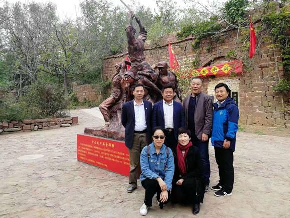 发展规划处党支部书记吴国玺同志一行6人沿着蜿蜒、平坦的山路,穿过方山寨的古牌坊,来到方山山顶。由红石垒成的寨门坐西朝东,寨门两侧挂有“破掳丹心昭日月,抗日碧血壮山河”的门联,门的正上方悬挂有“方山寨”3个鎏金大字。再往里走,正北是一排窑洞,外面立有多尊持枪、拿刀的方山抗日英豪群塑像,不远处还有张才千和皮定均的站姿塑像,他们与日军斗智斗勇战斗故事到现在还广为流传。